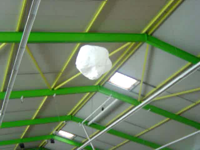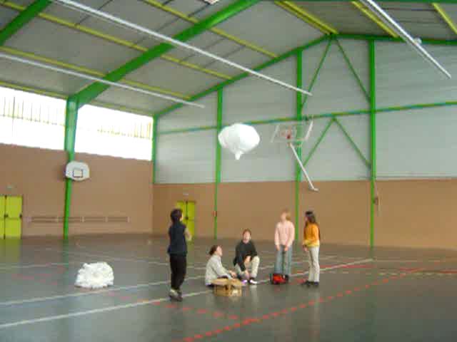 Envol de la montgolfière : On coupe les sèche-cheveux avant de laisser la montgolfière décoller d’elle-même grâce à la poussée d’Archimède ( il est important que la variation de température entre l’extérieur et l’intérieur de la montgolfière soit la plus grande possible)