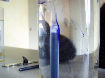 Afin de bien comprendre que l’air chaud monte, nous avons effectué une expérience basée sur les courants marins froids et chauds qui sont similaires aux courants d’air froids et chauds. Nous nous sommes munis de cartouches d’encre, de verre d’eau chaude et froide. Nous avons au préalable placé la cartouche d’encre dans l’eau chaude afin de la réchauffer puis nous l’avons percée et plongée dans le verre d’eau froide (elle fut lestée par un chewing-gum mâché).