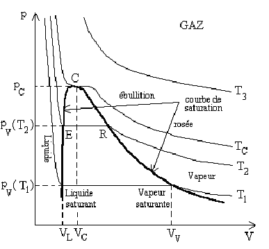 Un mélange liquide-vapeur est représenté par un point (qui dépend des proportions de vapeur saturante et de liquide saturant) du segment partant de l'état liquide saturant et finissant à l'état vapeur saturante sur la droite définie par une pression (appelée pression de vapeur saturante) constante. On rappelle que, sur ce segment, la température (appelée température de changement de phases ou d'état) est constante.