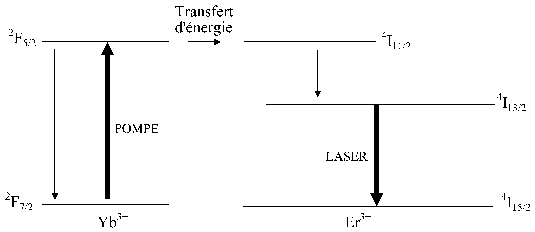 Le faisceau de pompe est absorbé par lion ytterbium, excitant ainsi ces atomes dans leur niveau dénergie supérieur (voir Figure 1). Ceux-ci transfèrent leur énergie aux atomes derbium, les excitant dans leur niveau 4I11/2. Ces atomes se désexcitent de manière non-radiative et très rapidement vers le niveau métastable 4I13/2.