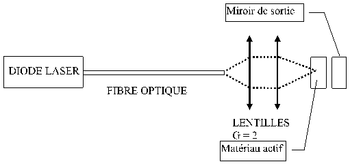 La sortie de la fibre optique est imagée avec un grandissement de 2 dans le matériau actif. Le matériau actif a une épaisseur de 2 mm et un diamètre de 10 mm, une de ses faces est traitée Rmax à 1,535 µm et Tmax à 980 nm alors que lautre face est traitée antireflet pour 980 mn et 1,535 µm. Le miroir de sortie de la cavité laser présente un coefficient de réflexion de 99% à 1,535 µm et est positionné à environ de 2 mm du matériau actif.