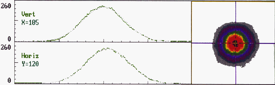 Dans cette configuration nous obtenons une puissance absorbée au seuil de lordre de 100 mW et un rendement différentiel denviron 19 % (voir Figure 5). Le laser est limité par la diffraction (M2» 1), sa divergence est denviron 6 mrad et le rayon du mode intra-cavité est de lordre de 80 µm. Le profil du faisceau est parfaitement gaussien (voir Figure 6).