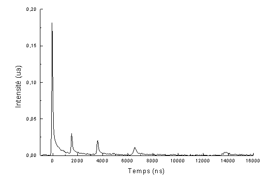 Le gain du laser étant faible (2 à 3 % pour un aller et retour dans la cavité), il nétait pas possible dutiliser des systèmes de commutation traditionnels (électro-optique, accousto-optique, ) car ils introduisent des pertes dans la cavité supérieures au gain obtenu. Nous avons déjà démontré le déclenchement par insertion dun disque tournant présentant un certain nombre douvertures dans la cavité []. Dans cet article, nous présentons le déclenchement par insertion dun diapason dans la cavité. Le schéma de la cavité est le même que celui présenté sur la Figure 4. Le diapason est inséré entre le matériau actif et le miroir de sortie. La fréquence de résonance du diapason est de 800 Hz et lamplitude des oscillations est de lordre de 2 mm. Dans ce régime, cinq ou six impulsions sont obtenues (voir Figure 7) car le temps pendant lequel la cavité reste ouverte est plus long que dans le cas du disque tournant. La largeur à mi-hauteur de la première impulsion est t =60 ns. Pour une puissance de pompe de 700 mW, lénergie totale émise est mesurée à laide dun joulemètre et dun amplificateur. Lénergie totale mesurée est de 6 µJ. Lénergie contenue dans la première impulsion est E=3 µJ.