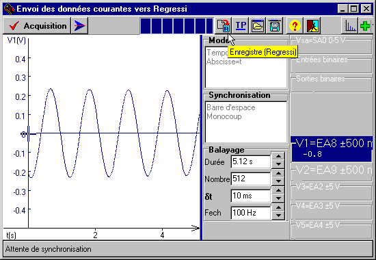 Première acquisition: cliquer pour transmettre à Régressi Windows