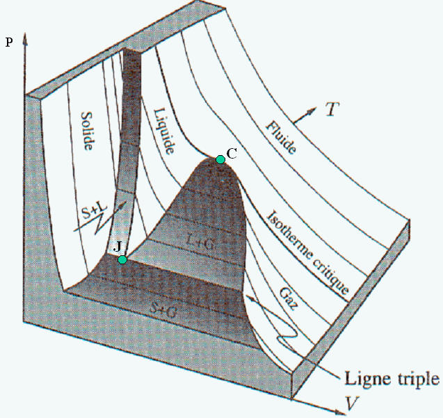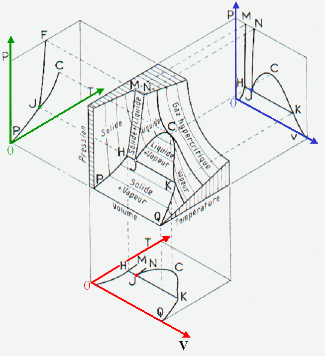 Représentation dans un espace à trois dimensions ( p, V, T ) des trois états de la matière d’un corps pur